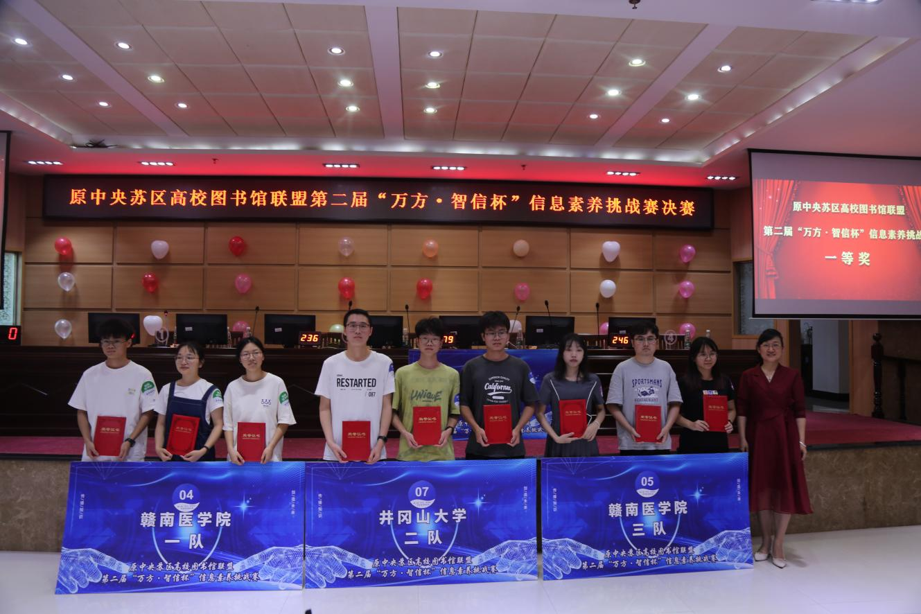 由原中央苏区高校图书馆联盟、赣南医学院图书馆主办,原中央苏区高校图书馆联盟各成员馆承办,北京万方数据股份有限公司、北京智信数图科技有限公司协办的第二届“万方•智信杯”信息素养挑战赛于2023年4月至5月顺利举行。本次挑战赛共吸引了赣州、吉安两地10所高校的3500余名在校学生参与。经过初赛、各校校内选拔、决赛等环节,挑战赛于2023年5月27日结束,共产生特等奖1个,一等奖3个,二等奖4个,三等奖4个,优秀奖13个;前12名的获奖团队指导老师获得“优秀指导老师”称号;10所学校荣获优秀组织奖。