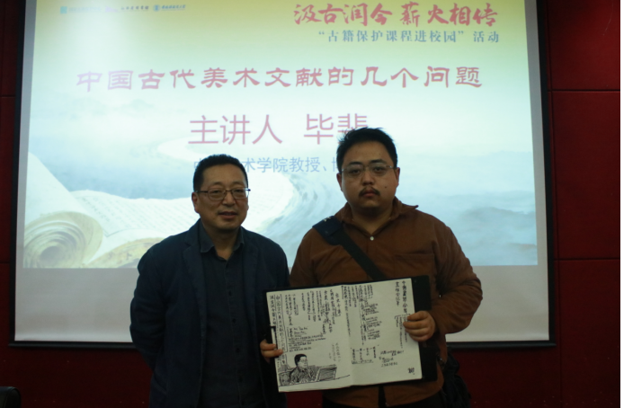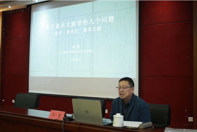 活动分为两个环节。首先,由中国美术学院美术史教授毕斐带来题为“中国古代美术文献的几个问题”的专题讲座。毕教授从美术、美术史以及美术文献三个维度,系统梳理了美术文献研究的脉络与方法。通过《历代名画记》《法书要录》《书苑菁华》等经典文献的生动展示,向师生们呈现了史传、著录、品评等多元文献形态,深入浅出地阐释了美术文献学作为连接古今艺术的桥梁,也分享了古籍校勘、保护的实践经验,让现场师生对中国古代美术文献的学术价值与文化意义有了更立体的理解。毕斐教授的讲座融汇理论与实践的壁垒,深刻地启示我们:古籍并非尘封的典籍,而是鲜活的文化密码。讲座尾声,毕教授回答了同学们的提问,现场交流气氛热烈。