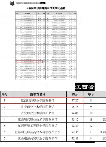 近日,由武汉大学中国科学评价研究中心,中国科学学与数字出版智能服务技术教育部工程研究中心研发的《数智时代中国图书馆影响力指数报告(2025版)》正式发布。江西财经职业学院图书馆获五星图书馆评价,蝉联中国高职高专图书馆影响力排行榜江西省第1位,全国排名由2024年的第59位跃升至第21位,首次进入“职专院校图书馆影响力三十强”。