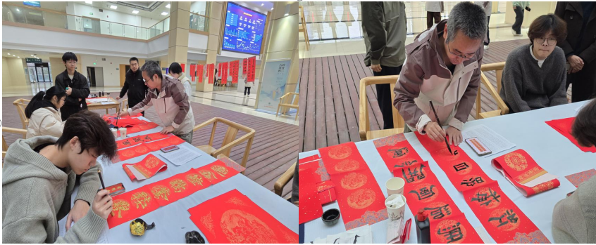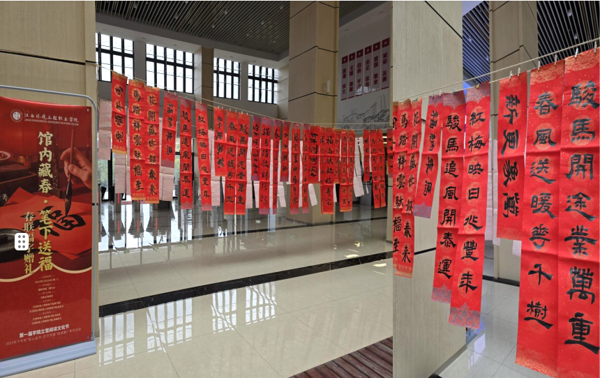 为传承中华优秀传统文化,营造喜庆祥和的节日氛围,12月24日下午,由江西环境工程职业学院图书馆主办的“馆内藏春·笔下送福”春联福字赠礼活动在图书馆二楼大厅开展。