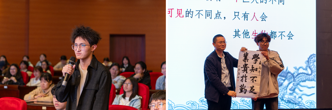 讲座最后,石馆长与现场听众进行了互动交流,围绕人生困惑、学习意义等问题展开深入讨论。他还将亲手撰写的字画赠予现场师生,现场气氛热烈,师生纷纷表示受益匪浅。